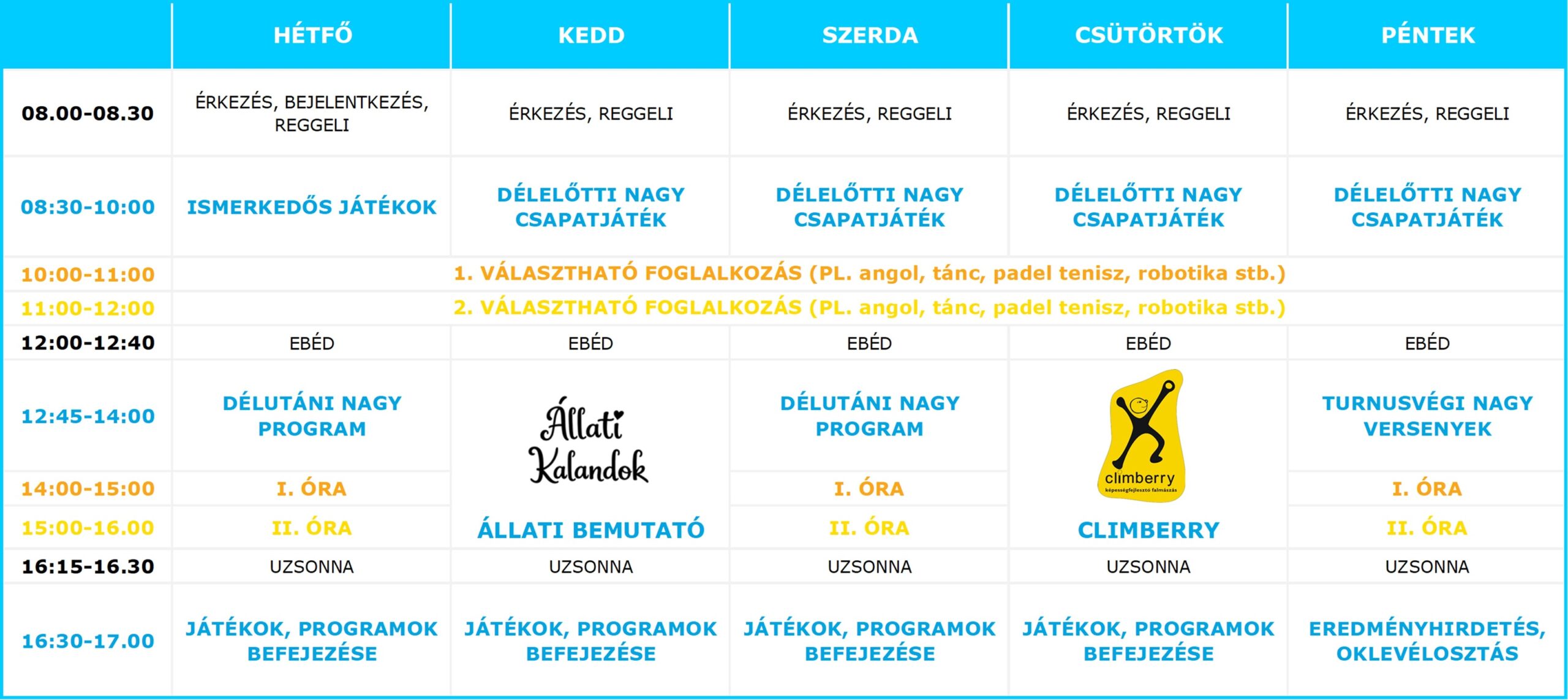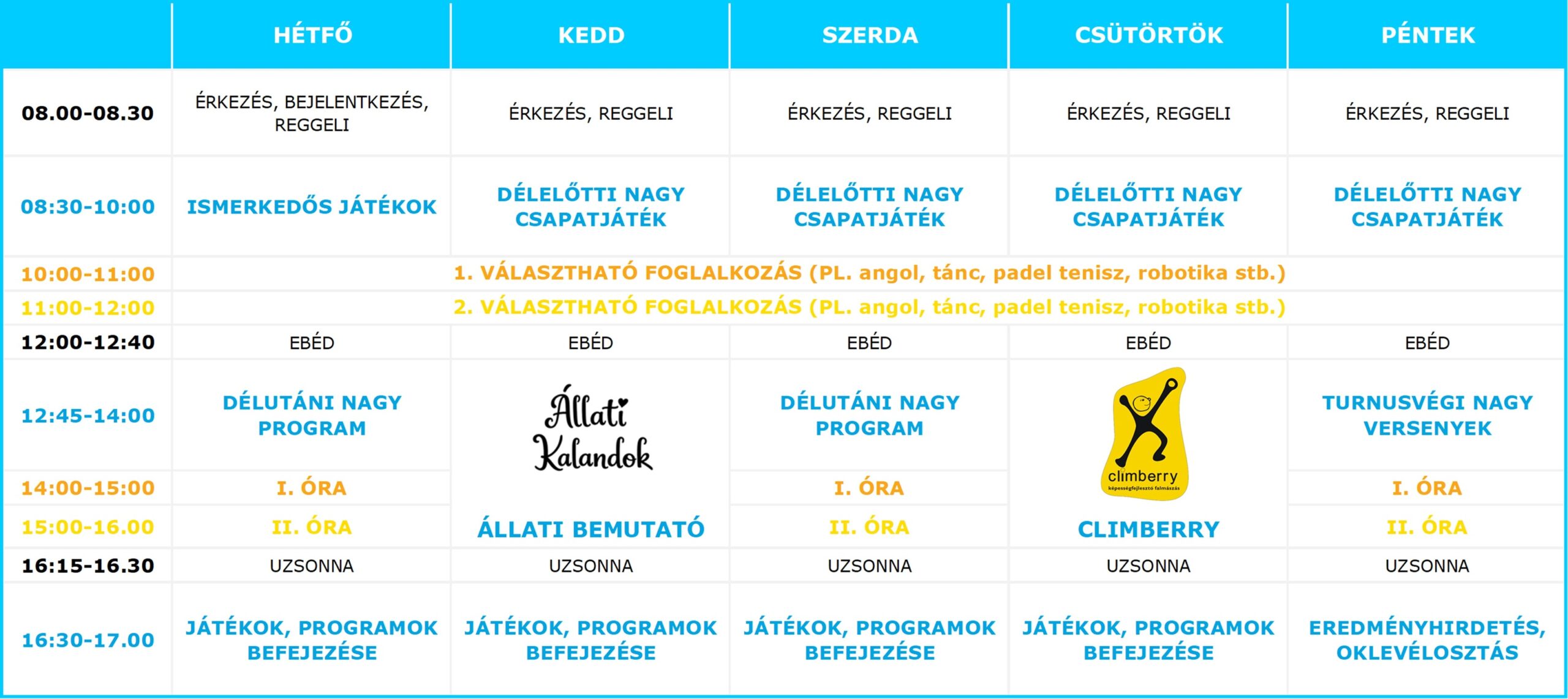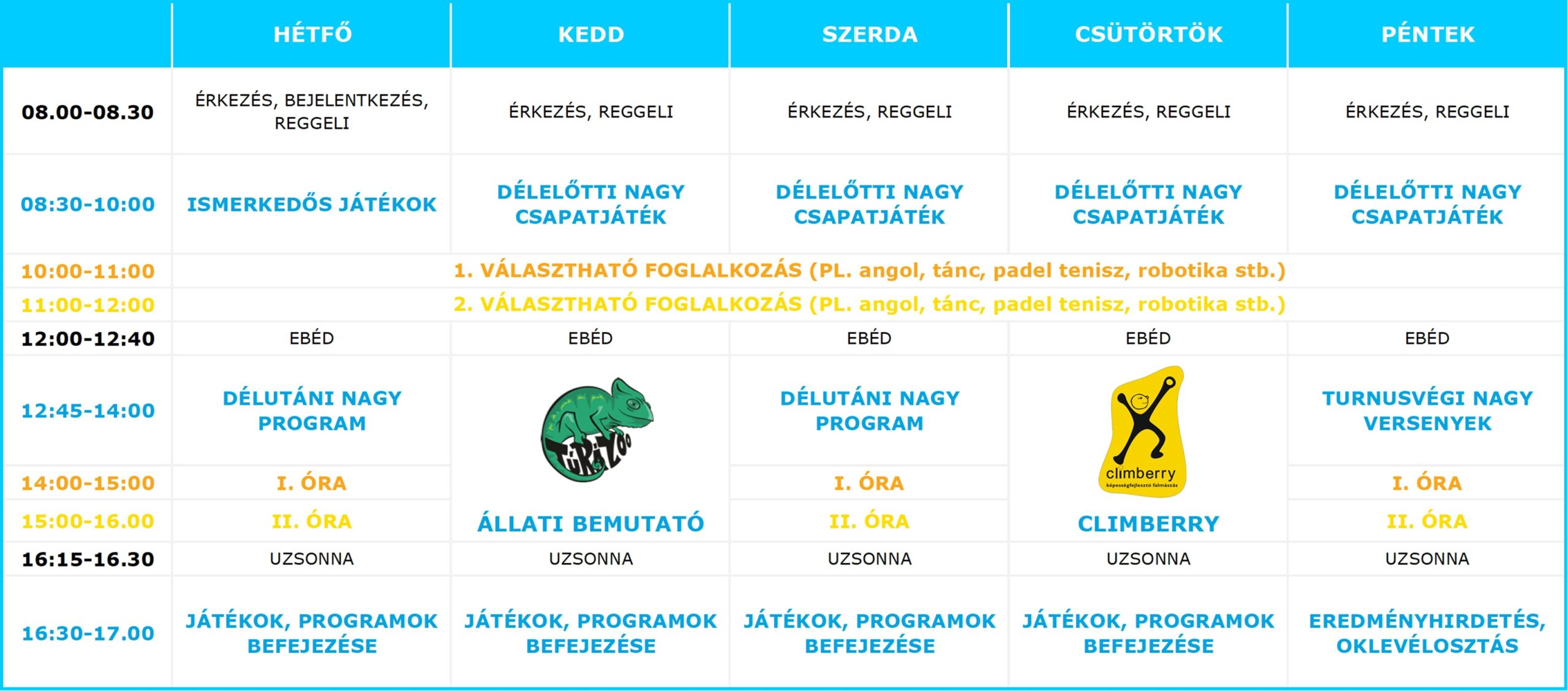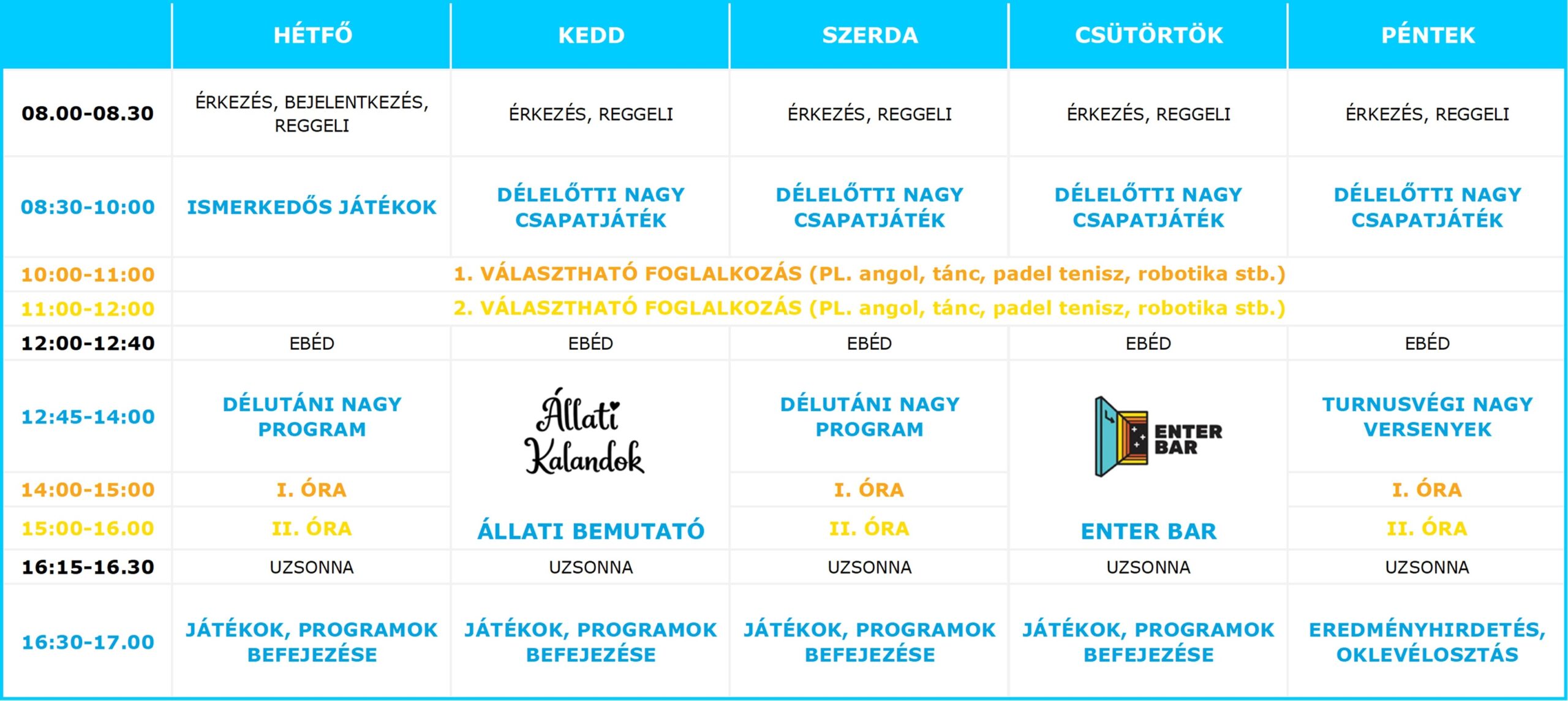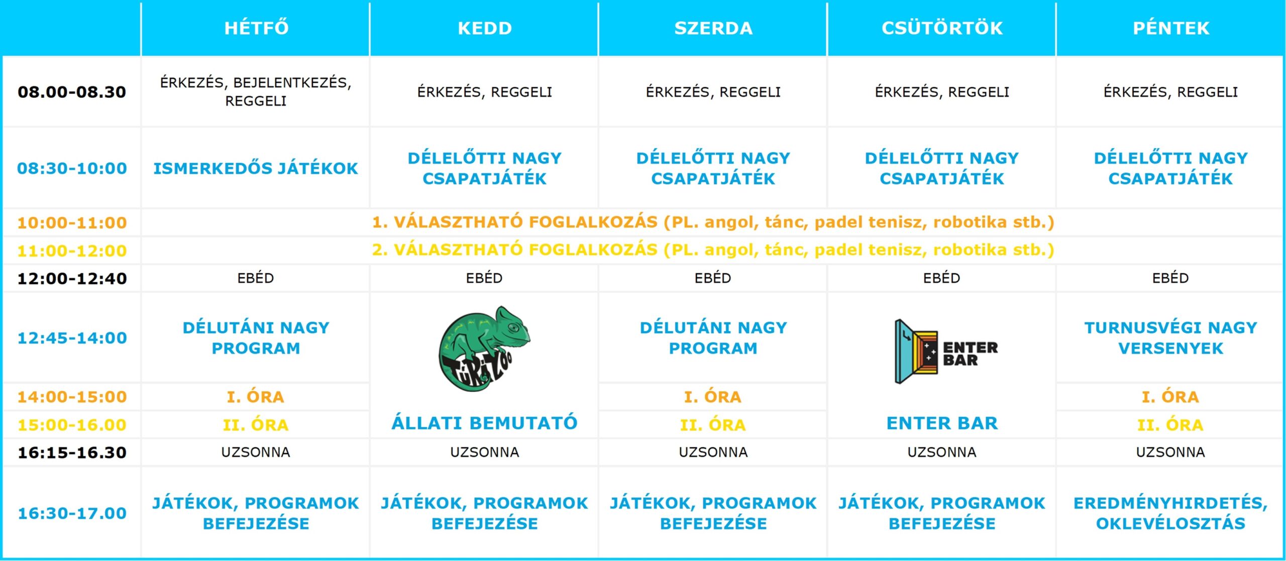 Minden turnus hétfőn kezdődik és pénteken ér véget. Táborunk az egész nyári szünetben, naponta reggel 8 és délután 5 óra között tart nyitva (szükség esetén 6 óráig ügyeleti nyitvatartással). Az oktatáson kívüli időben versenyeket, vetélkedőket, játékokat és sokféle sportos programot rendezünk, ezek mindegyikét a tábor helyszínén tartjuk. Minden nap valami más programmal találkozhatsz nálunk: a ping pong vagy csocsó-versenytől, a színjátszós-beöltözős és arcfestős programokon át a kincskereső játékig nagy a mókatárunk!