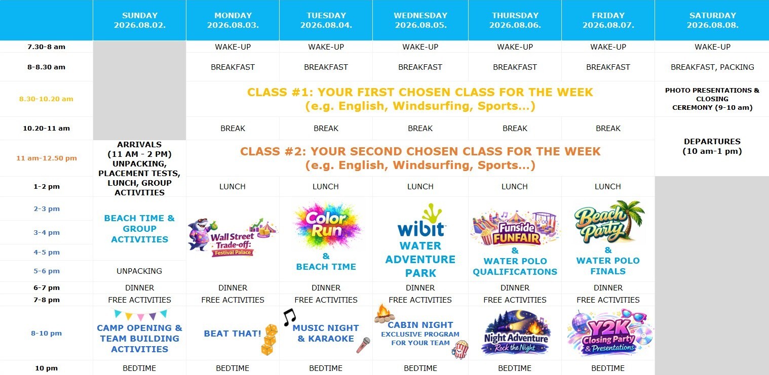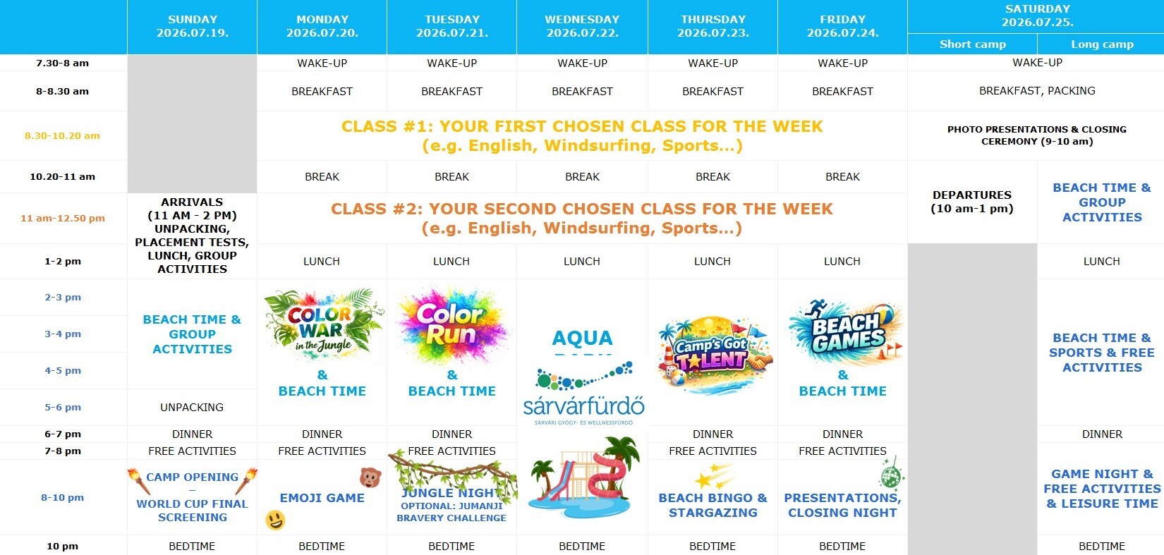 Sessions start on Sundays and end on Saturdays. When staying for multiple weeks, your stay also includes the Saturday nights between the sessions. The afternoon and evening activities are the same for all of our campers, regardless of which classes they choose for the mornings. For example, if you are attending the combination of English and Dance Camps, and you have a friend who is attending the SUP and Sports Camp, you will still see each other at the afternoon and evening activities! The afternoon and evening activities are also bilingual: our speakers will explain everything in both English and Hungarian.