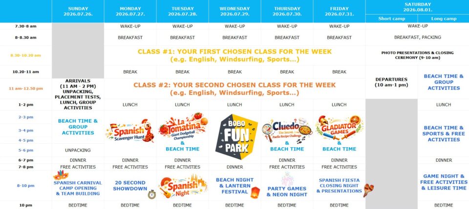 Friday brings the ultimate finale with heroic challenges: teams face off on the Gladiator Games obstacle course, then enjoy a refreshing break by the Balaton before the evening Camp Closing Ceremony. We wrap up the week with a lively Fiesta Closing Party, celebrating together all the victories, laughs, and unforgettable moments of the Spanish adventure.