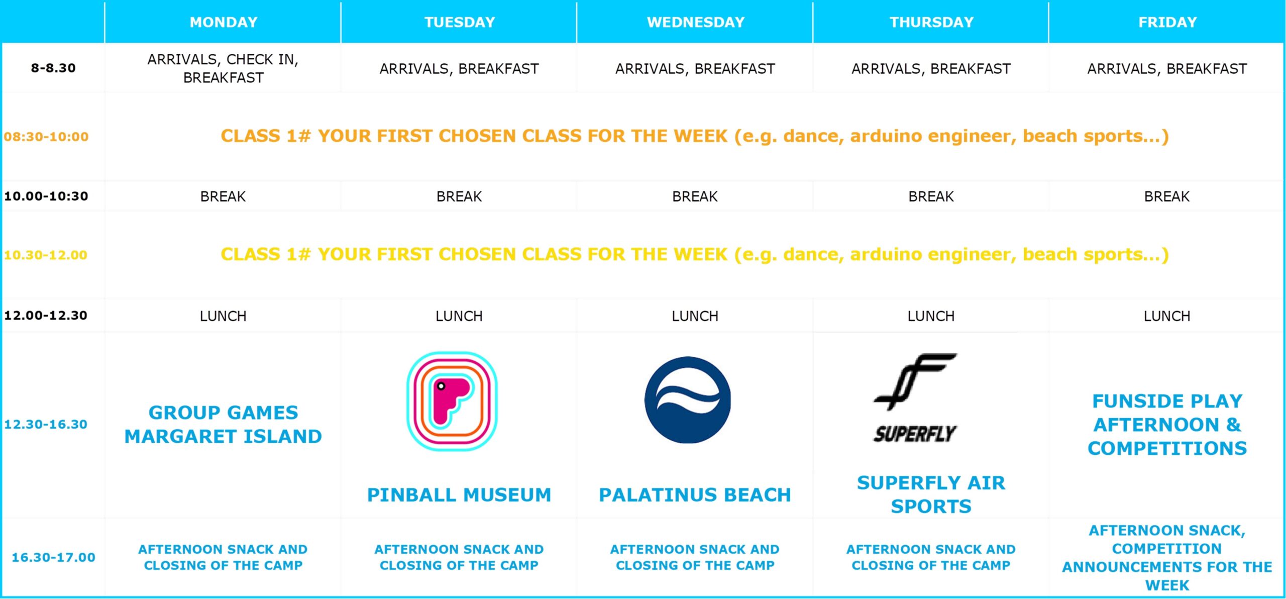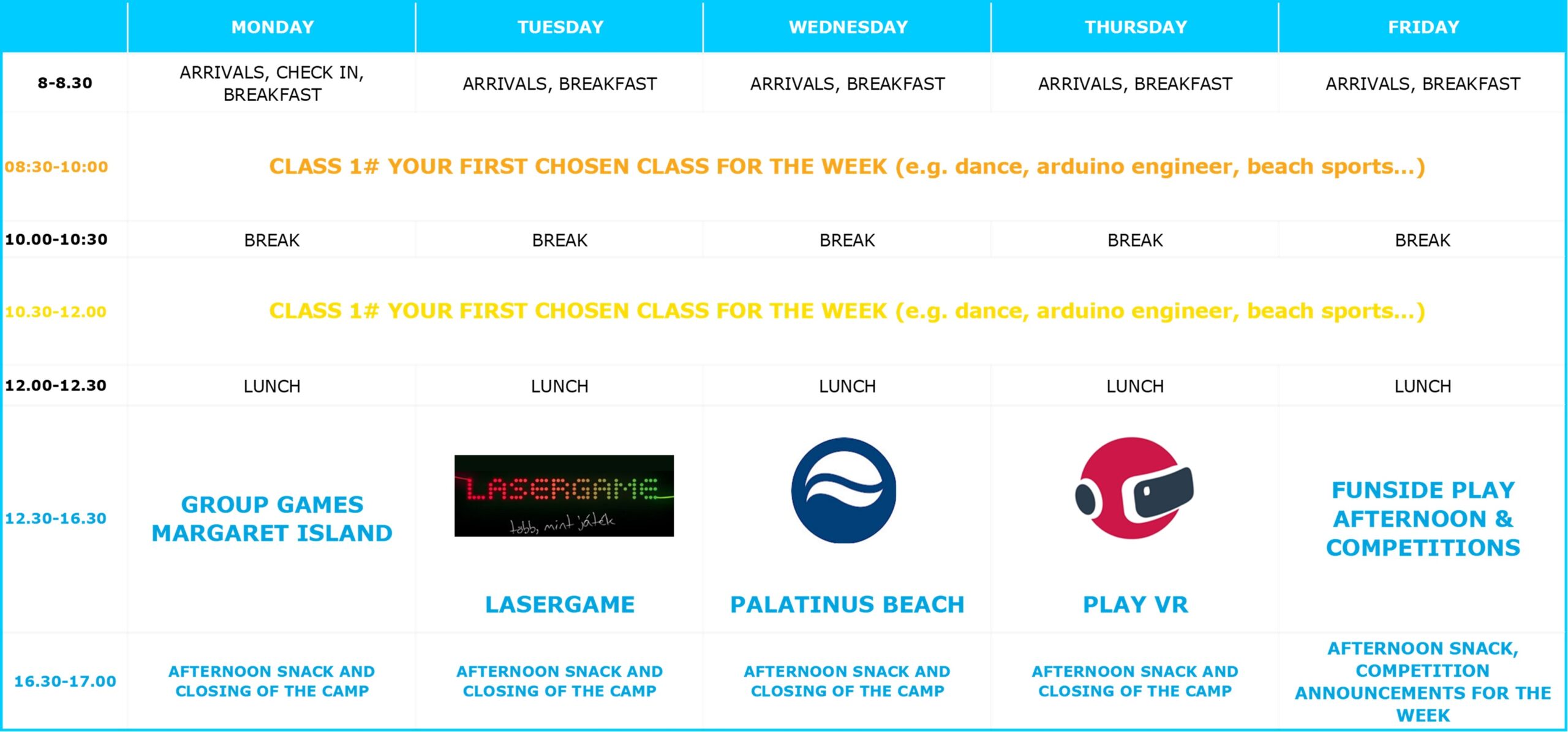Each session runs from Monday to Friday. Our camp is open throughout July and August, daily from 8 am to 5 pm. Classes take place in the mornings in two 1.5-hour time slots, held in the modern and welcoming classrooms of Budapest School as well as on the sports fields of Margaret Island. In the afternoons, we organize outdoor activities, games and competitions, along with active sports programs at nearby venues. Whenever the weather allows, we spend as much time outdoors as possible — and the nearby sports facilities ensure that even on rainy days, the camp atmosphere stays fun and carefree!