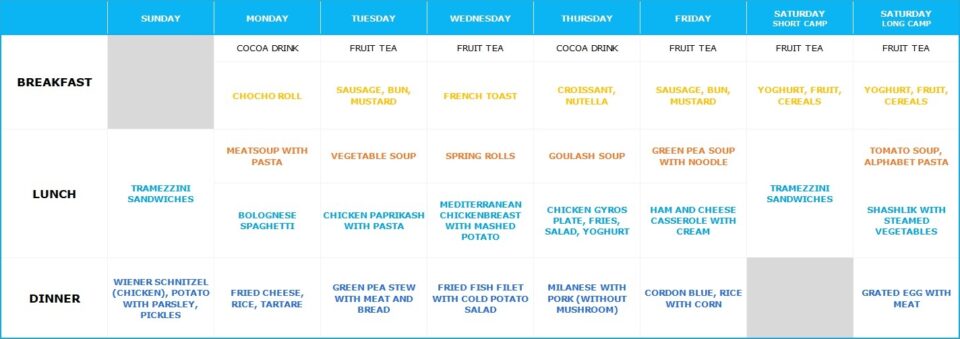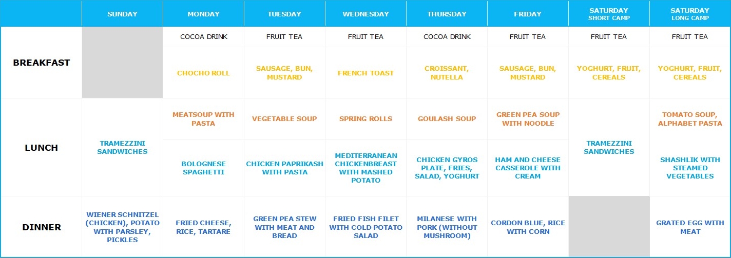 Our camp location, the Balatongyörök Youth Camp, operates its own camp kitchen on-site, providing breakfast, a warm two-course lunch, and a warm dinner for both the regular and vegetarian menus. Due to the nature of the camp kitchen, the meals are child-friendly, simple, and consist of traditional dishes, reflecting the style typical of classic camp kitchens in Hungary. At our request, the menu often includes dishes inspired by international cuisines, aligning with the camp's international character. Starting in 2024, campers also have the option to choose cereal instead of the breakfast listed on the menu.