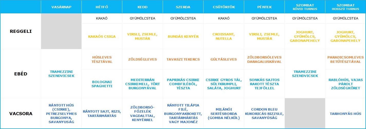 A menüsor az egyes turnusok között is változik, illetve évről évre bővül új ételekkel. A lenti menüsor egy tipikus heti menü volt a 2025-ös táborunkban: