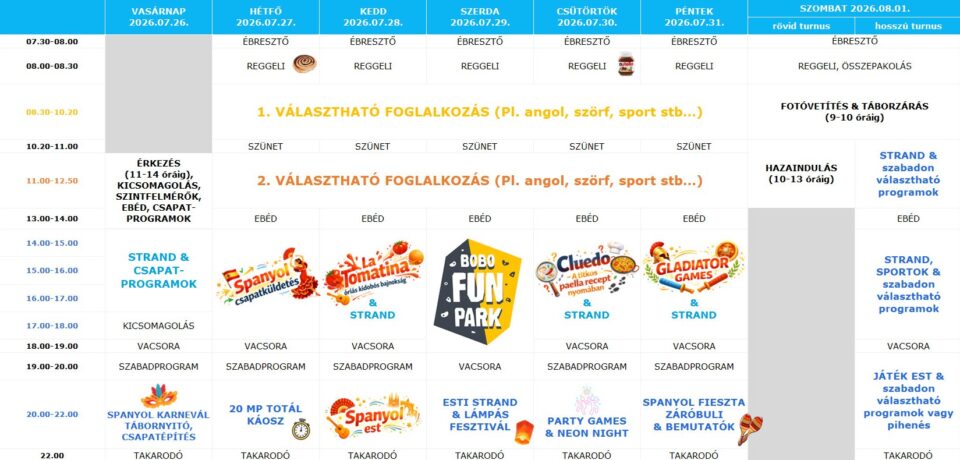 A turnus fináléja pénteken hősies küzdelmeket ígér: a Gladiator Games akadálypályáin mérhetik össze erejüket a csapatok, majd lehetőség nyílik egy Balaton-parti felfrissülésre az esti Táborzáró előtt. Végül egy pezsgő Fiesta Záróbulival búcsúzunk a spanyol kalandoktól, ahol együtt ünnepeljük a hét sikereit és felejthetetlen pillanatait.